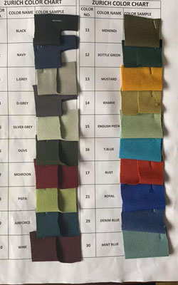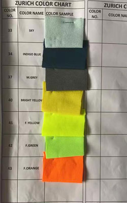Imported Zuric fabric with 95% polyester 5% lycra, and more than 30 colors. 60 inch open width dia in rolls form in poly packing